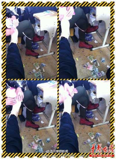 ¡¡¡¡Í¼Æ¬ÏÔʾ£¬Ò»ÃûŮѧÉúÕý×øÔÚ½ÌÊÒµÄ×ùλÉÏ£¬¸ø´ÓÅÔ±ß×ùλÉÏÉì³öµÄÒ»Ö»½ÅÓÃÇ®²ÁЬ£¬µØÃæÉÏÓжàÕÅ1Ôª¡¢5Ôª¡¢10Ôª¡¢100Ôª½ð¶î²»µÈµÄÖ½±Ò¡£