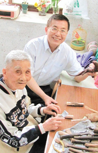¡¡¡¡94ËêÕÔÊÀ½Ü£¨×ó£©ÈÏÑøÂÌÔ°µÀ»¨Ô°ÈȳÀ£¬Äõñ¿Ìµ¶´´×÷ľÒÕÆ·¡£Í¼Æ¬À´Ô´£ºÌ¨Íå¡¶ÁªºÏ±¨¡·