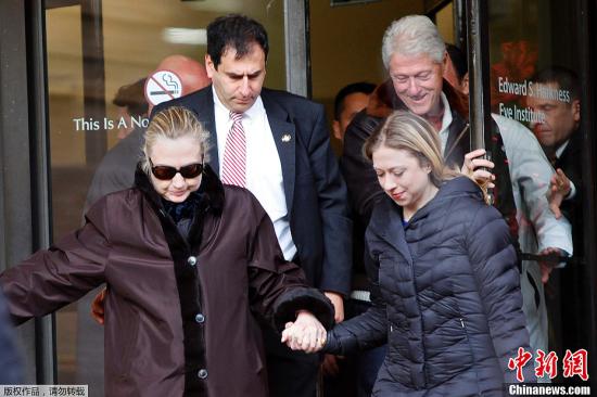 当地时间2013年1月2日,美国国务卿希拉里·克林顿在丈夫比尔·克林顿和女儿切尔西的陪同下出院。希拉里在2012年12月15日曾因病晕倒,撞到头部,造成脑震荡。12月30日,希拉里在纽约一家医院接受复查时,被发现体内有淤血,随即住进了医院。