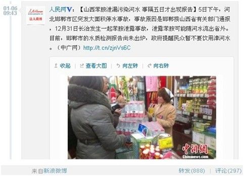 近日,因山西境内发生事故性污染物排放,化工厂苯胺泄漏水体污染,导致河北邯郸突发大面积停水,市民纷纷走出家门购买饮用水。事隔5日才出报告,长治市新闻中心办公室主任表示并未迟报事故,污染不出市界不必上报引发网络舆情。