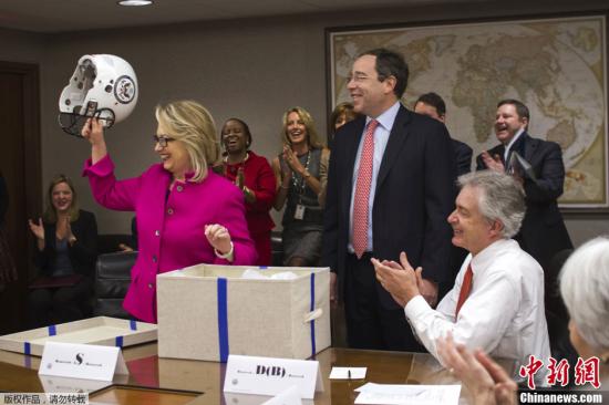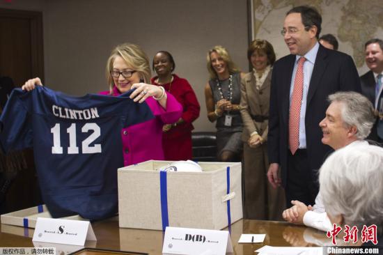 当地时间1月7日,美国华盛顿,美国国务卿希拉里在生病之后重返工作岗位。她在国务院会议上收到了副国务卿Tom Nides送上的“运动大礼包”,欢迎其“归队”。据悉,希拉里因为脑部出现血栓在长达一个月的时间内缺席国务院会议。