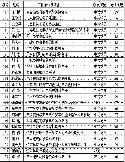 根据《2012年丹东市差额遴选副局级年轻干部工作实施方案》规定,经过笔试,按照笔试成绩从高到低确定21名中共党员干部人选和4名非中共党员干部人选进入差额推荐程序,现予以公告,按姓氏笔画排序。
