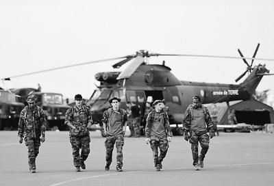 图为20日,几名法军士兵走在马里首都巴马科附近一处机场的跑道上。