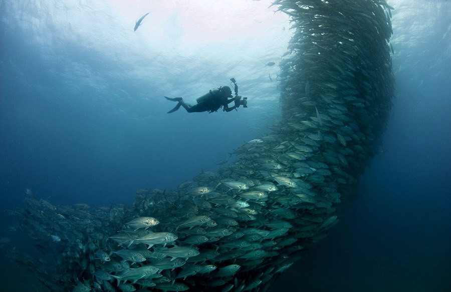 千条小鱼聚集“求偶” “瞪眼”鱼群好似龙卷风