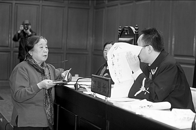 许麟庐女儿许娥在法庭上辨认其他兄弟姐妹提供的笔迹样本。本报记者蒲东峰摄