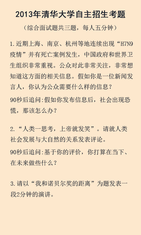 对此于涵说:“自主招生考试绝对不是小高考,更不是高考的加强版。可能以前有人认为自主招生就像高考前的一次加分考试。但是现在如果你认为只是多一次机会,那就错了。因为它是对学科特长、创新潜质人才的选拔。”