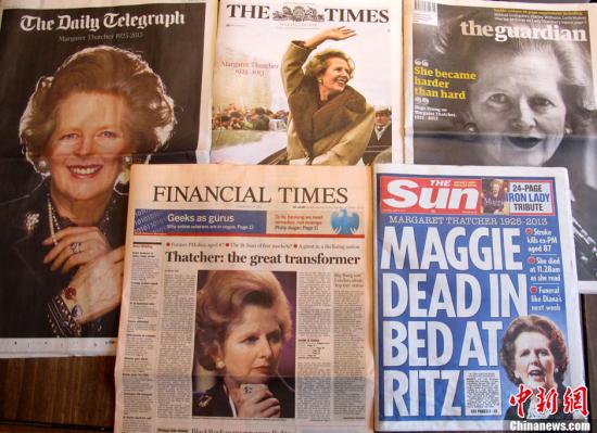 英国前首相撒切尔夫人4月8日去世,9日出版的英国各大报纸均在头版报道“铁娘子”去世的消息。周兆军 摄