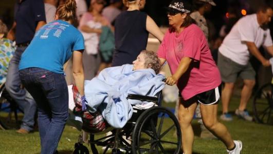 当地时间4月17日,美国德克萨斯州一间化肥厂发生爆炸。图为爆炸后附近人员疏散到一所学校体育场,包括养老院老人。