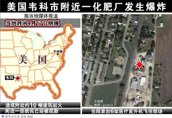新华网北京4月18日电(记者林杉)美国得州韦科市发生的化肥厂爆炸摧毁了大约三个街区的面积,化肥厂附近一处养老院被大火吞没。
