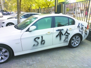 北京晚报讯(记者王琼)昨天中午,一辆停放在后现代城小区A座1号楼下的宝马3系轿车,被人用黑漆喷上了“不会停车”几个大字。同时遭殃的还有一辆白色奔驰轿车。