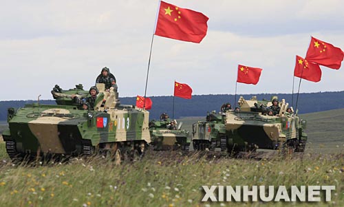 8月13日,在俄罗斯的车里雅宾斯克州的切巴尔库尔合成训练场,中方参演部队搭乘新型伞兵战斗车机动。 新华社记者 李刚 摄