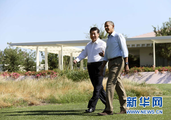 当地时间6月8日上午,中国国家主席习近平同美国总统奥巴马在美国加利福尼亚州安纳伯格庄园举行第二场会晤。会晤开始前,习近平和奥巴马在风光秀丽的庄园内散步,在轻松的气氛中交谈。新华社记者 兰红光 摄