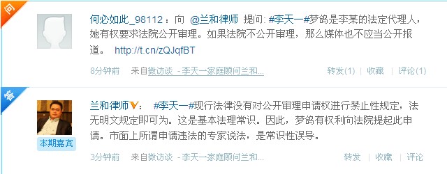 网友在访谈中提出:“梦鸽是李某的法定代理人,她有权要求法院公开审理。如果法院不公开审理,那么媒体也不应当公开报道。”。对此,兰和回答:“现行法律没有对公开审理申请权进行禁止性规定,法无明文规定即可为。这是基本法理常识。因此,梦鸽有权利向法院提起此申请。市面上所谓申请违法的专家说法,是常识性误导。”