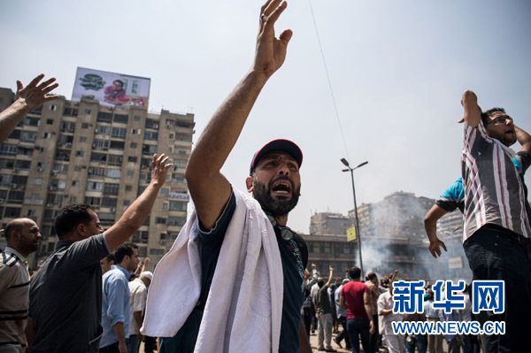 8月14日,在埃及开罗纳赛尔城阿达维耶清真寺附近,穆尔西支持者呼喊口号。埃及国家电视台援引总统府声明称,埃及从14日下午4时(北京时间14日22时)起进入紧急状态,为期一个月。 新华社记者李木子摄