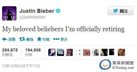 人民网北京12月26日电 (李岩)据台湾媒体报道,加拿大偶像歌手19岁的小贾斯汀(Justin Bieber)发推文“我正式宣告退休了!”,称自己准备退出歌坛,引起全球死忠粉丝及媒体疯狂讨论。这项讯息转贴已超过24万次,影迷留言更把小贾推特灌爆。目前正值耶诞假期,经纪公司还没回应,不少人都不太相信,也有很多粉丝大惊“不!”