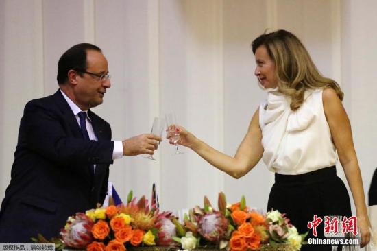 据外媒报道,法国总统奥朗德1月25日宣布结束与瓦莱丽·特里耶韦莱的男女朋友关系。图为2013年10月14日,奥朗德和特里耶韦莱在比勒陀利亚参加晚宴。(资料图)