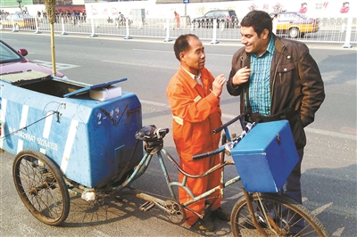 南锣环卫大叔正在与外国游客交谈(资料图) 摄影/本报记者 魏彤