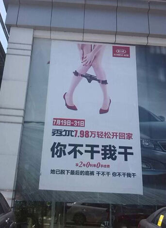 从网友提供的照片可以看到,该广告为起亚汽车某款车型的促销广告,但醒目的广告语和广告画面都相当低俗。