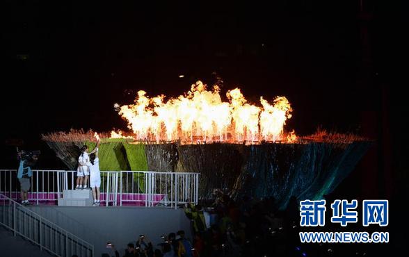 19日晚的开幕式上,韩国女星李英爱和两名小朋友一起走到主火炬旁,用最原始的方式点燃了仁川亚运会主火炬。