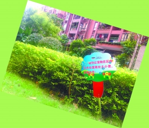 记者走访看到,该小区内的绿化情况良好,很多树木上都挂着牌子,写着“花草树木已喷农药,人畜勿进”等提示语。而在草坪上,也设置了不少呼吁文明养犬的标牌。