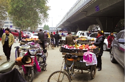 商贩的占道车辆集中在棉纺路北侧停放,形成小型集市,将小区东门外的公交港湾也占压了一多半。