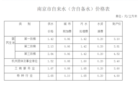 公开资料显示,南京现行水价执行的是南京市物价局2012年发布的《南京市物价局关于调整自来水价格的通知》。从当年6月1日起,居民生活用水从每吨2.8元涨至3.1元,其中包括了城市公用事业附加费、污水处理费、水资源费三项,价格分别为每立方米0.06元、1.42元、0.2元。除此之外,每月5元的垃圾处理费也由南京水务集团有限公司代收。