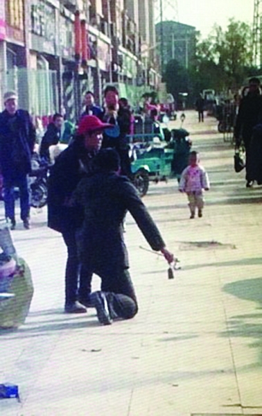 目击者说,头戴红帽子的老人大约60岁,他先看到老人推着车在收废品,这时一个城管人员走过来,把老人的秤拿走了。老人可能见秤被拿了,一下子跪在城管面前。老人刚跪下去,城管也跪了下去。老人见状马上站起来,双手拉住城管的胳膊,准备把对方给拉起来。