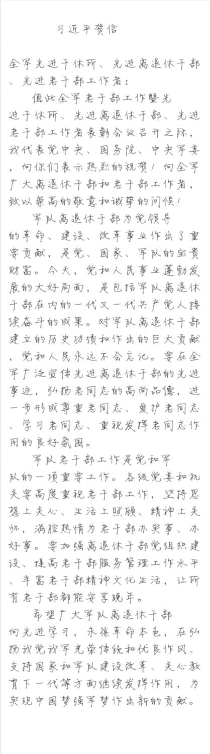 习近平致信全军老干部工作暨“三先”表彰电视电话会议,代表党中央、国务院、中央军委,向受到表彰的全军先进干休所、先进离退休干部和先进老干部工作者表示热烈的祝贺,向全军广大离退休干部和老干部工作者致以崇高的敬意和诚挚的问候。