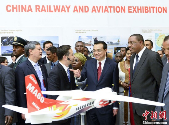 5月5日,李克强总理与埃塞俄比亚总理海尔马里亚姆、非洲联盟委员会主席祖马共同参观在亚的斯亚贝巴非盟会议中心举办的中国铁路航空展。海内外媒体称赞李克强为“超级推销员”。2014年他5次出访,带回的订单总计超过1400亿美元。