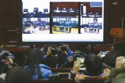 媒体旁听席记者对着屏幕拍摄庭审画面