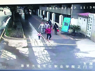 监控视频显示,7日上午11时34分,红衣女子带着女童小雪行走在长江职业学院正门口