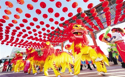 二月十八日,北京地坛庙会上举行精彩的舞狮表演。新华社记者 李 欣摄