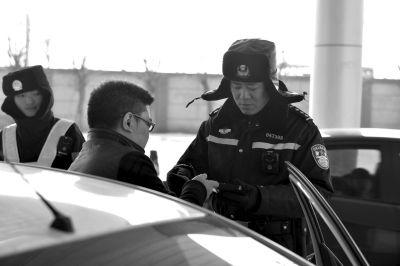 邓秋民在检查司机的驾照和行驶证。京华时报记者赵思衡摄
