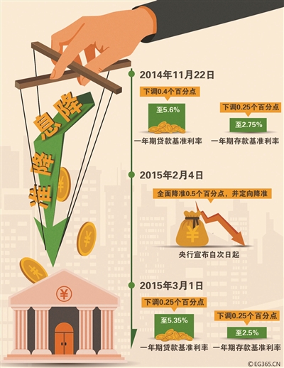 正如市场预期的那样,央行降息之举没有结束。继去年11月非对称降息后,央行昨天晚间宣布,自2015年3月1日起下调金融机构人民币贷款和存款基准利率。金融机构一年期贷款基准利率下调0.25个百分点至5.35%;一年期存款基准利率下调0.25个百分点至2.5%,其他各档次存贷款基准利率及个人住房公积金存贷款利率相应调整。