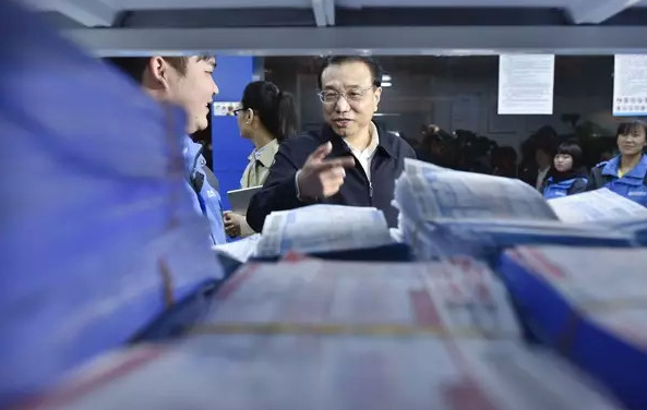2014年11月19日,李克强在浙江义乌青岩刘村了解网店、物流派送等配套服务情况(中新社记者 刘震 摄)
