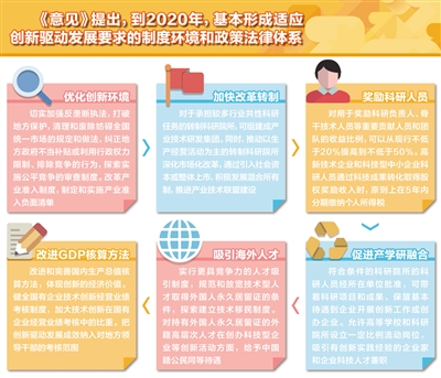 《意见》指出,到2020年,基本形成适应创新驱动发展要求的制度环境和政策法律体系,为进入创新型国家行列提供有力保障。