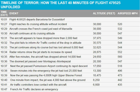 失事航班最后40分钟运行图显示,当地时间10:01分,飞机从西班牙巴塞罗那起飞,前往德国的杜塞尔多夫。26分钟后抵达巡航高度(1.1万米),但10:31分,飞机掉落2000英尺(约610米),飞行员未能通知空管中心,随后飞机继续沿飞行路线飞行,但再次掉高2400米,10:34分,雷达显示飞机航速加大,此时飞机已经掉高4200米。10:37分,飞机飞过法国的皮伊穆瓦松机场,继续快速掉落。10:40分,飞机高度仅1200米,1分钟后飞机失去联络。
