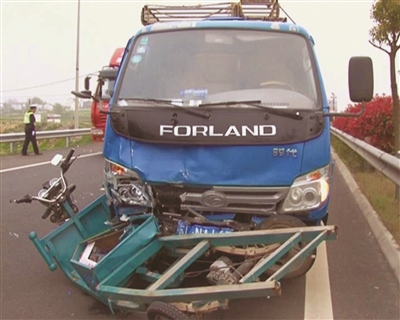 记者在现场看见,电瓶三轮车被蓝色货车撞击后车身卡在货车车头位置,已经严重变形,三轮车的后车座部分则被撞飞出20多米远,撒落在马路对面。地面上满是撞击碎片和大摊血迹。货车司机在事故发生后并没有逃走,自己报警后,被赶到的交警带走调查。120急救人员也很快赶到现场将三轮车上两名伤者送往医院抢救。但令人感到遗憾的是这两名女子一名死亡,另一名重伤目前正在接受进一步治疗。