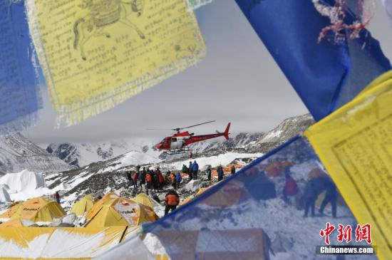 当地时间4月25日,尼泊尔强震引发珠穆朗玛峰雪崩,部分基地大本营被埋。救援队紧急救援。