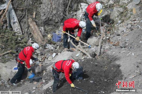 当地时间2015年3月29日,法国Seyne-les-Alpes,搜救人员搭乘直升机前往德翼客机坠机地点继续收集客机残骸。