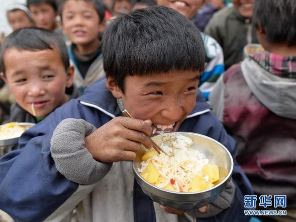 4月29日,萨勒完小的学生们在吃午饭。吉隆县萨勒完小位于西藏边境村之一的萨勒村中,受尼泊尔地震影响,萨勒完小的住宿房、教学房、教师办公房都在地震中出现了不同程度损毁。学生在地震发生后被迫停课。 4月28日,地震后的第三天学校复课,学校目前临时设置在萨勒村安置点内,现有教学用帐篷两顶,住宿用帐篷三顶。28日安置点开始通电,教师去周边村庄打水来提供生活用水。师生们在临时搭建的帐篷内开始了正常的教学与食宿。 新华社记者 刘东君 摄