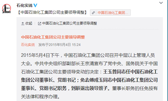 人民网北京5月4日电 据中国石化新闻办公室官方微博消息,2015年5月4日下午,中国石油化工集团公司召开中层以上管理人员大会。中共中央组织部副部长王京清宣布了党中央、国务院关于中国石油化工集团公司主要领导变动的决定:王玉普同志任中国石油化工集团公司董事长、党组书记;免去傅成玉同志中国石油化工集团公司董事长、党组书记职务,到龄退出领导班子。董事长职务的任免按有关法律和程序办理。