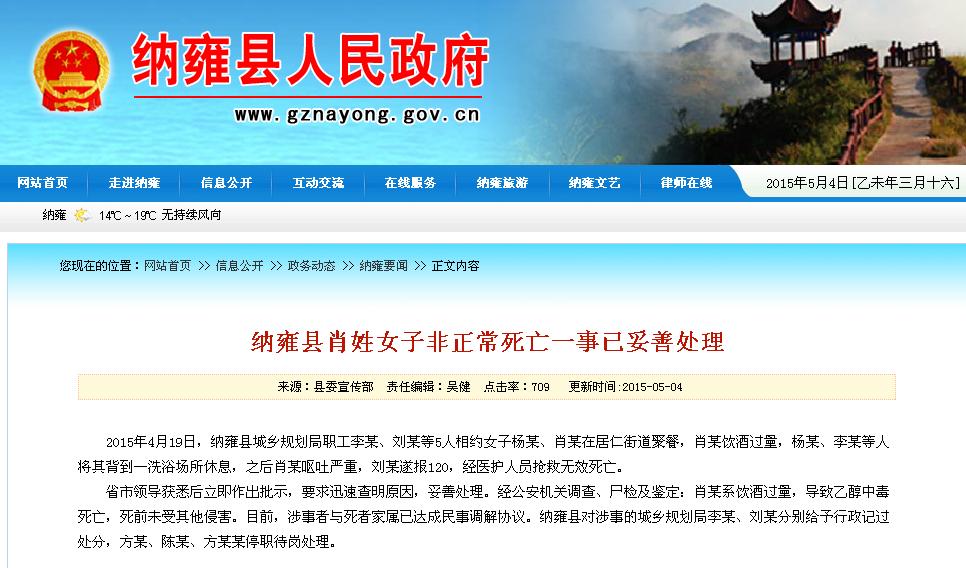 5月4日,记者查阅发现,纳雍县人民政府网站刊发了题为《纳雍县肖姓女子非正常死亡一事已妥善处理》的公告。公告中称,4月19日,纳雍县城乡规划局职工李某、刘某等5人相约女子杨某、肖某在居仁街道聚餐,肖某饮酒过量,杨某、李某等人将其背到一洗浴场所休息,之后肖某呕吐严重,刘某遂报120,经医护人员抢救无效死亡。尸检报告表明肖某系乙醇中毒死亡,死前未受其他侵害,涉事者与死者家属已达成民事调解协议。纳雍县对涉事人员以行政记过处分或停职待岗处理。(孝金波 王璐)