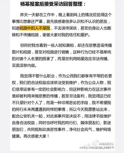 今日下午,杨幂就网传不雅照视频一事到派出所报案。之后,她透过工作室官方微博对此事进行回应。除强调视频中并非她本人外,杨幂还称此事“比想象中还严重”,“我看到一些人明知真相,却还在而已造谣传播图片和视频,甚至对视频进行销售,这种行为已经不是单纯的对谁个人名誉的损害了,而是在利用明星效应非法传播,买卖淫秽内容”。