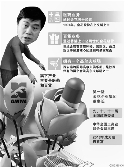 北京青年报记者昨天登录金花集团官网看到,董事长吴一坚的“总裁致辞”及吴的照片被放在网站的醒目位置。根据官网显示,生于西安的吴一坚今年55岁,研究生文化程度,经济师。身为民建委员的吴一坚,是第九、十、十一届全国政协委员,第十届全国工商联副主席,第八、九、十届全国青联常委,陕西省第十二届人大常委会委员。此外,他还有一系列比较耀眼的头衔,包括:中国民间商会副会长,中国工业经济联合会主席团主席,中国中小企业协会副会长等。在金花内部,他身兼金花投资控股集团总裁、金花企业(集团)股份有限公司董事长,世纪金花商业控股有限公司董事长职务,其中后两家企业分别是在上交所和港交所上市的企业。
