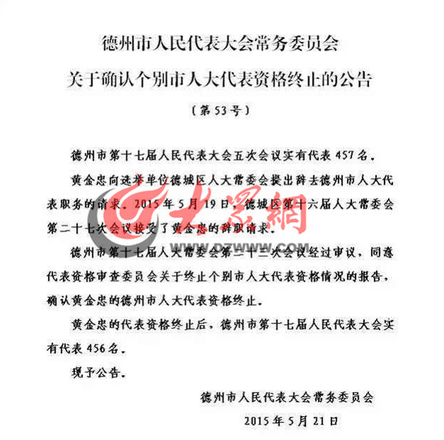 公告称,黄金忠向选举单位德城区人大常委会提出辞去德州市人大代表职务的请求。2015年5月19日,德城区第十六届人大常委会第二十七次会议接受了黄金忠的辞职请求。德州市第十七届人大常委会第二十三次会议经过审议,同意代表资格审查委员会关于终止个别市人大代表资格情况的报告,确认黄金忠的德州市人大代表资格终止。