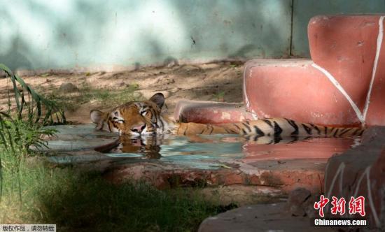 当地时间2015年5月26日,印度,动物园的孟加拉虎趴在水池里消暑。据媒体报道,印度部分地区高温天气导致的死亡人数已超过1000人。