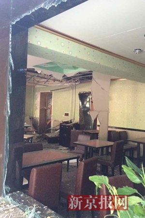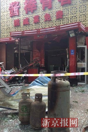 今日8时许,新京报记者在定安路看到,一家名叫“太阳火酱棒骨春饼店七店”的餐馆门前二十余平方米的区域内,铁卷门、玻璃窗、玻璃门、椅子一片狼藉,玻璃渣满地,十个大小不一的煤气罐摆在门口,餐馆门前拉着警戒线。餐馆内天花板掉落,后厨出现垮塌。