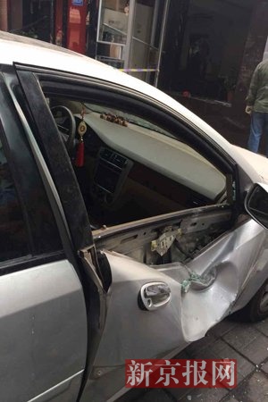 此外,几辆停靠在附近的小轿车也遭了殃,车窗玻璃破碎、车体变形扭曲,一家离事发餐馆三四十米的烤鸭店的玻璃墙出现了一道几十厘米长的裂痕。