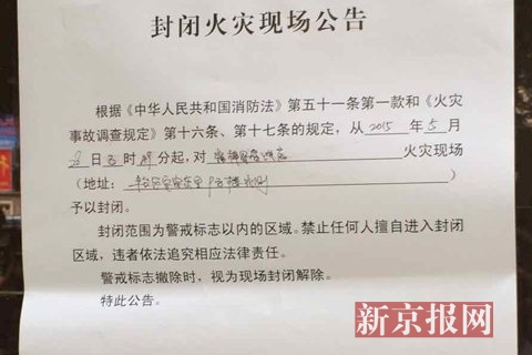 丰台区消防支队张贴在门口的封闭火灾现场公告显示,凌晨3时49分起,事发餐馆及附近区域被封闭。